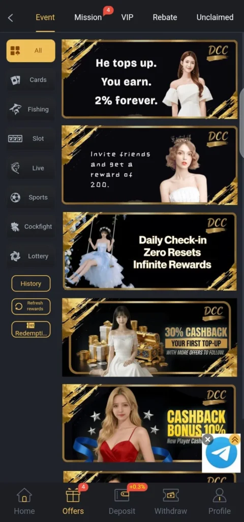 DCC6 APK provides attractive rewards like welcome bonuses, daily login rewards, and special promotions. These bonuses encourage users to stay active on the platform.