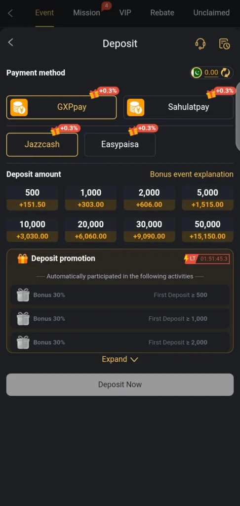 Users can deposit money using local payment methods like Jazz Cash and Easy paisa. The process is simple and usually completed within a short time.